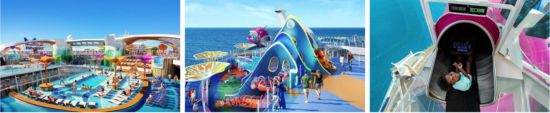 FOR THE SUN OF IT: It's all about that vacay wade of life at the redesigned pool deck on the all-new Wonder of the Seas℠. Soak up the sun, chill in the shade, get your adrenaline fix, or grab a cocktail from the two-story poolside bar The Lime & Coconut℠. And for the ultimate pool day upgrade, reserve one of our private poolside casitas.. BIG TIME PLAYTIME: Ditch the same-old neighborhood playground for a whole new way to explore. The all-new Playscape is studded with slides, climbing walls, games and puzzles where adventurers of all ages can discover an underwater world with endless possibilities. ONLY FOR THE BRAVE: There's a place where only the bold venture and only the bravest return. Step to the edge. Peer into the darkness. There's no turning back once you take the plunge 10 stories down the tallest slide at sea. Are you brave enough — or will you become a permanent resident of the Ultimate Abyss℠?